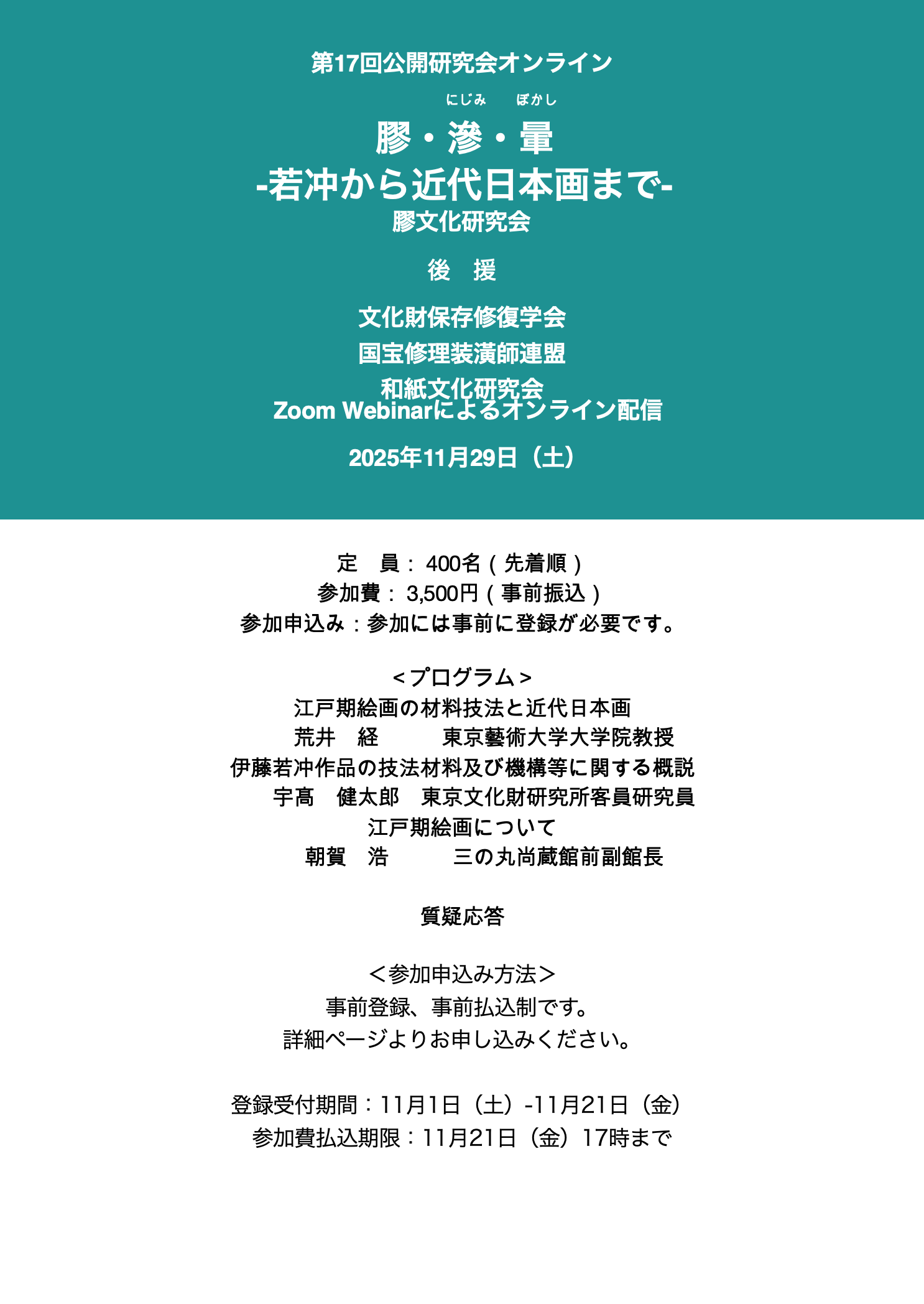 膠文化研究会第17回公開研究会オンライン「膠・滲・暈 -若冲から近代日本画まで-」を開催します。受付は11月1日(土)からです。